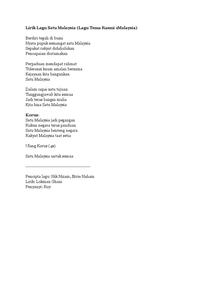 Perpaduan mendapat rahmat Toleransi kaum amalan bersama. Lirik lagu Malaysia Bersih MALAYSIA BERSIH LAGU. Lirik Lagu Satu Malaysia.
